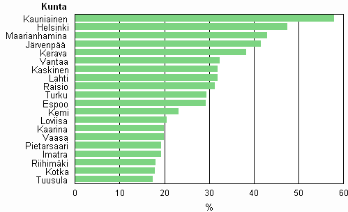 Rakennetun maan osuus maapinta-alasta kunnittain, 20 kärjessä