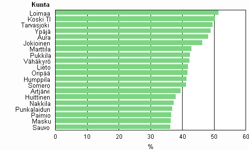 Maatalousmaan osuus maapinta-alasta kunnittain, 20 kärjessä