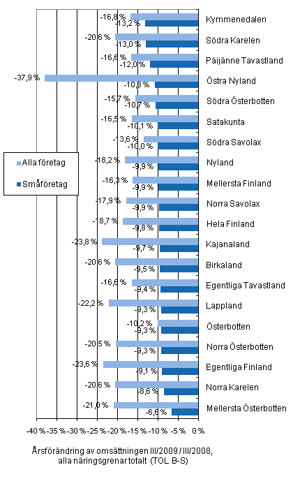 Under juli - september år 2009 minskade omsättningen för småföretag ganska jämnt i alla landskap, men mindre än omsättningen för större företag. Mest minskade småföretagens omsättning i Kymmenedalen (-13,2%), Södra Karelen (-13%) och Päijänne-Tavastland (-12%).