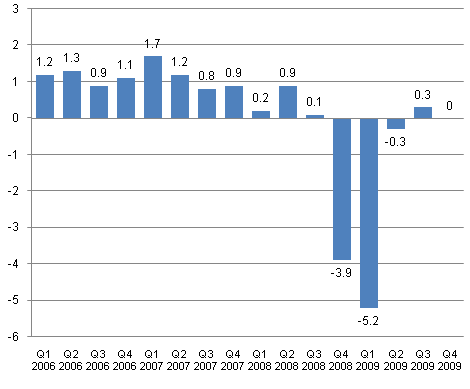 According to the preliminary data compiled by Eurostat, in the last quarter of 2009 GDP grew in the EU area by 0.1 per cent from the previous quarter but contracted by 2.3 per cent from twelve months back.