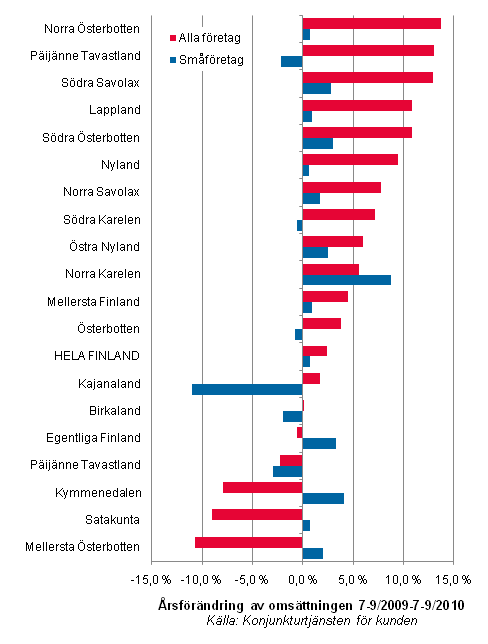 Omsättningen inom små byggföretag utvecklades under granskningsperioden mest gynnsamt i Norra Karelen, där ökningen jämfört med året innan var nästan nio procent. I Kymmenedalen nådde man en ökning på drygt fyra procent och i Egentliga Finland en ökning på över tre procent. I Kajanaland sjönk de små byggföretagens omsättning med 11 procent, även om omsättningen för alla företag under samma tid ökade med något under två procent.