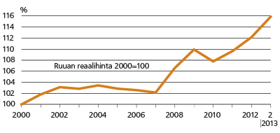 Ravinnon reaalihinta, hintojen muutos suhteessa koko kuluttajahintaindeksiin, pysyi melko vakaana vuodesta 2000 vuoden 2007 loppuun saakka. Sen jälkeen ravinnon hinta on noussut selvästi yleistä hintakehitystä nopeammin.