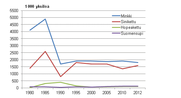 Tarhattujen turkiseläinten määrä on vähentynyt alle puoleen vuodesta 1985. Kun vuonna 1985 turkiseläimiä oli tarhattuna 8,2 miljoonaa yksilöä, vuonna 2012 määrä oli enää 3,6 miljoonaa. Näistä minkkejä oli 1,8 miljoonaa ja sinikettuja 1,6 miljoonaa. Hopeakettuja ja suomensupeja oli noin 100 000 yksilöä. Tiedot löytyvät Tilastokeskuksen uudesta julkaisusta Ympäristötilasto – Vuosikirja 2013.