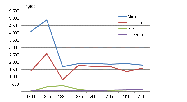 The number of farmed fur animals has decreased by more than one-half since 1985. While there were 8.2 million farmed fur animals in 1985, in 2012 there were only 3.6 million. Of these, 1.8 million were minks and 1.6 million blue foxes. There were some 100,000 silver foxes and raccoon dogs. These data derive from Statistics Finland's new publication, Environment Statistics Yearbook 2013.