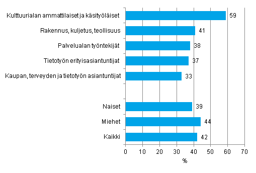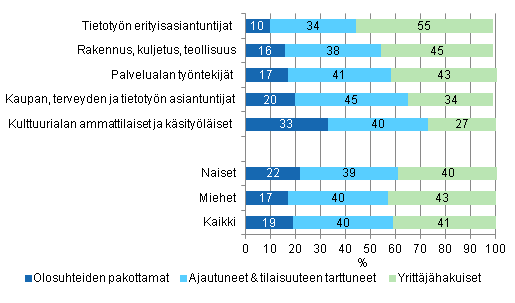 Ammattiryhmien välillä on huomattavia eroja yrittäjyyteen ryhtymisessä. Joka kolmas kulttuuri- ja käsityöammateissa toimivasta itsensätyöllistäjästä on päätynyt yrittäjyyteen olosuhteiden pakosta. Tietotyön erityisasiantuntijoista vain joka kymmenennellä on tällainen tausta. Tiedot käyvät ilmi Tilastokeskuksen Itsensätyöllistäjät 2013 -tutkimuksesta.