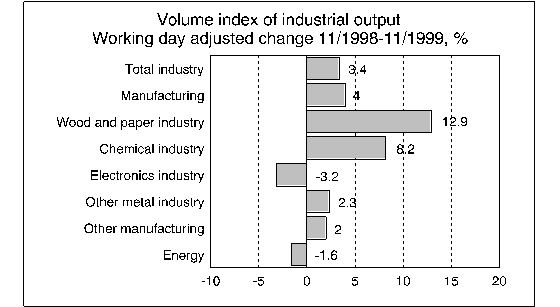 In the January to November period, industrial output was up by 4.5 per cent on the corresponding period in 1998. Output in the metal industry increased by just under 9 per cent. The fastest grower was the electronics industry, where output went up by nearly 23 per cent. Output in the chemical industry grew by 2.5 per cent. In the wood and paper industry, output increased by good 2 per cent. Output in other manufacturing fell by just short of one per cent compared to the January to November period of the year before last.