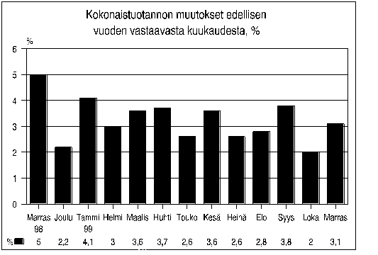 Kokonaistuotannon määrä oli viime vuoden marraskuussa 3,1 prosenttia suurempi kuin vuoden 1998 marraskuussa. Tuotanto lisääntyi suurin piirtein tammi-marraskuun keskimääräistä vauhtia. Tilastokeskuksen laskeman kokonaistuotannon kuukausikuvaajan mukaan tuotanto kasvoi kansantalouden kaikilla päätoimialoilla.