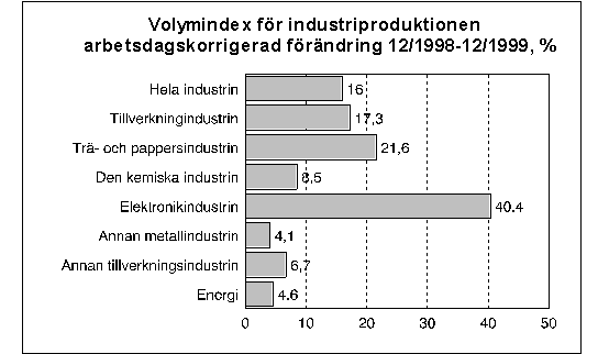 Enligt Statistikcentralen var den arbetsdagskorrigerade industriproduktionen i december i fjol 16 procent större än i december 1998. Den rekordartade tillväxten förklaras huvudsakligen av att trä- och pappersindustriproduktionen ökade med närmare 22 procent. Produktionen inom elektronik-industrin ökade också med drygt 40 procent efter några anspråkslösa tillväxtmånader. Den höga tillväxtprocenten beror också på att industriproduktionen vid jämförelsetidpunkten, dvs. december 1998, inte ökade från året förut.