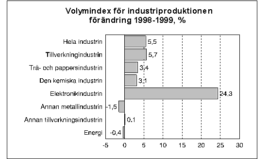 Industriproduktionen var i fjol 5,5 procent större än år 1998. Tillväxten var fortsättningsvis snabbast inom elektronikindustrin, där produktionen ökade med drygt 24 procent. Den övriga metallindustri-produktionen minskade däremot med 1,5 procent. Produktionen inom den kemiska industrin ökade med 3 procent, likaså inom trä- och pappersindustrin. Produktionen inom den övriga fabriksindustrin var på samma nivå som år 1998.