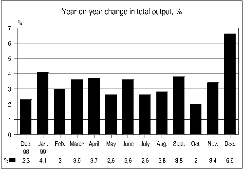 Output in construction grew by 6.8 per cent from December 1998. In transport, output increased by 3.7 per cent and in trade by 2.8 per cent. Other services and government services increased by 1.6 per cent. In agriculture and forestry, output remained at the previous year's level.