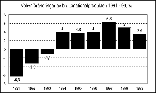 Volymen av bruttonationalprodukten ökade enligt Statistikcentralens preliminära uppgifter med 3,5 procent 1999. Totalproduktionen har nu ökat oavbrutet sedan år 1994. Bruttonationalprodukten, dvs. den sammanlagda värdeökningen av producerade varor och tjänster, var i fjol 718 miljarder mark.