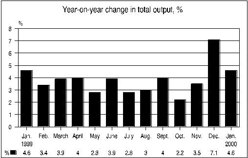 The volume of total output was 4.6 per cent greater in January 2000 than in January 1999. In December 1999, output grew by 7.1 per cent from the previous year. The Monthly Indicator of Total Output of Statistics Finland indicates that output went up in all main industries of the national economy.