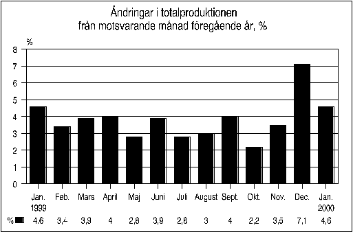 I januari 2000 var totalproduktionen 4,6 procent större än i januari 1999. I december 1999 ökade produktionen med 7,1 procent från föregående år. Enligt Statistikcentralens månadsgraf över totalproduktionen ökade produktionen inom alla huvudnäringsgrenar i samhällsekonomin.