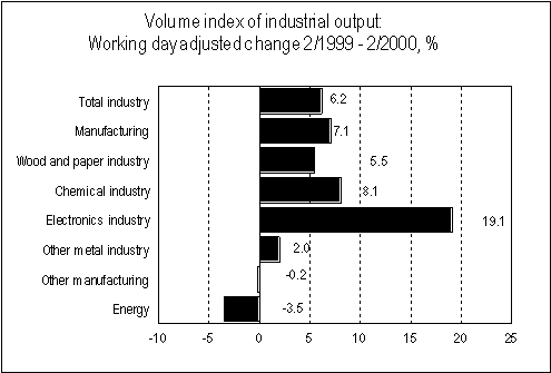 According to Statistics Finland, Finnish industrial output as calculated per working day went up by 6.2 per cent in the year to February 2000.