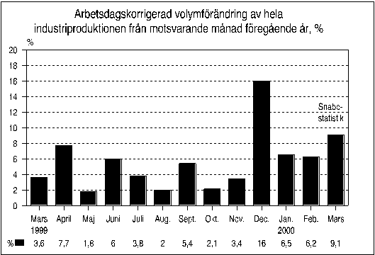 Enligt Statistikcentralen var den arbetsdagskorrigerade industriproduktionen i mars 9,1 procent större än i mars 1999. Denna snabbstatistik bygger på de uppgifter som Statistikcentralen hade tillgång till före den 27 april.