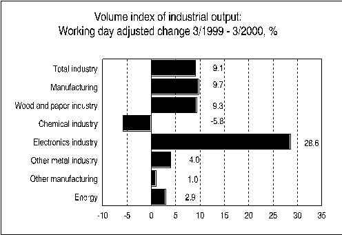 Output in the wood and paper industry grew by 9.3 per cent from the previous year in March, as against 5.4 per cent in February. In the electronics industry, output increased by nearly 29 per cent in March, while in February it went up by 19 per cent. In the rest of the metal industry, too, output increased by 4 per cent in March, as against 2 per cent in February. In contrast, output in the chemical industry fell by close on 6 per cent, due to industrial action within the industry. In February output in the chemical industry grew by good 8 per cent. In other manufacturing, too, output increased by one per cent.