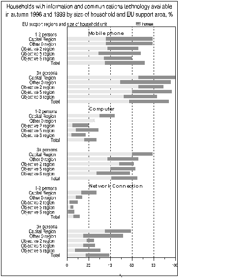 In the 1996 to 1999 period, the mobile phone grew common in small and family households alike in all Finnish regions. In the sparsely populated areas of Northern and Eastern Finland (EU's Objective 6 region) and in the areas undergoing structural industrial change (EU's Objective 2 region), however, the number of households with a mobile phone grew less than in other areas.