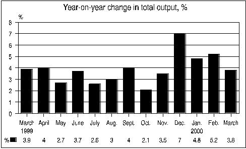 The volume of total output was 3.8 per cent greater in March 2000 than in March 1999. In February, output grew by 5.2 per cent from the previous year. The Monthly Indicator of Total Output of Statistics Finland indicates that output went up in all main industries of the national economy, except in agriculture and forestry, and trade.