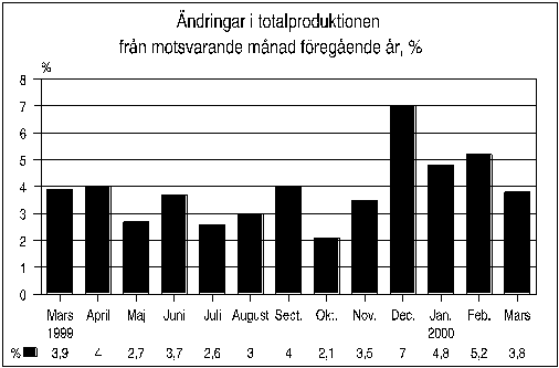 I mars 2000 var totalproduktionen 3,8 procent större än i mars 1999. I februari ökade produktionen med 5,2 procent från föregående år. Enligt Statistikcentralens månadsgraf över totalproduktionen ökade produktionen inom alla huvudnäringsgrenar i samhällsekonomin med undantag av jord- och skogsbruk samt handel.