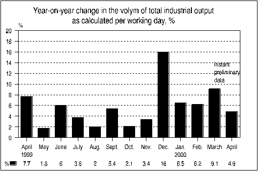 According to Statistics Finland, industrial output as calculated per working day was 4.9 per cent higher in April 2000 than in April 1999. These instant preliminary data are based on information available to Statistics Finland on 30 May.