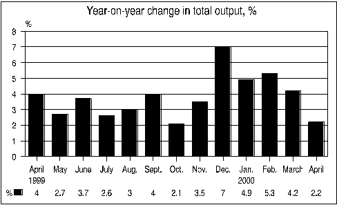 The volume of total output was 2.2 per cent greater in April 2000 than in April 1999. In March, output grew by 4.2 per cent from the previous year. The Monthly Indicator of Total Output of Statistics Finland indicates that output went up in all main industries of the national economy with the exception of agriculture and forestry, and transport.