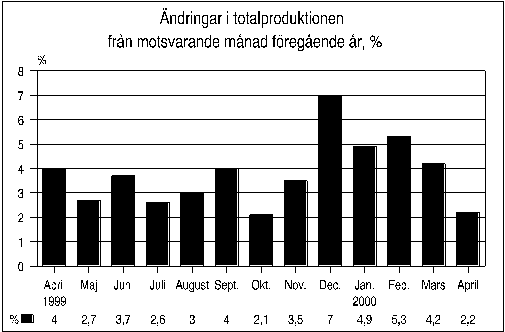I april 2000 var totalproduktionen 2,2 procent större än i april 1999. I mars ökade produktionen med 4,2 procent från föregående år. Enligt Statistikcentralens månadsgraf över totalproduktionen ökade produktionen i april inom alla huvudnäringsgrenar i samhällsekonomin med undantag av jord- och skogsbruk samt samfärdsel.