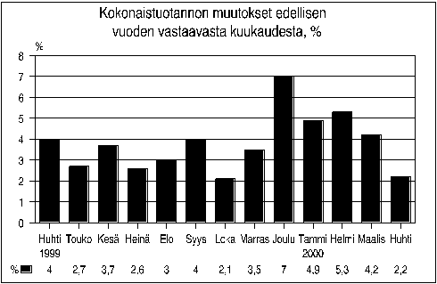 Kokonaistuotannon määrä oli 2,2 prosenttia suurempi huhtikuussa 2000 kuin vuoden 1999 huhtikuussa. Maaliskuussa tuotanto kasvoi 4,2 prosenttia edellisestä vuodesta. Tilastokeskuksen laskeman kokonaistuotannon kuukausikuvaajan mukaan tuotanto kasvoi huhtikuussa maa- ja metsätaloutta sekä liikennettä lukuun ottamatta kansantalouden kaikilla päätoimialoilla.