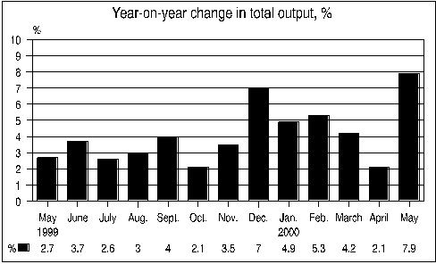 The volume of total output was 7.9 per cent greater in May 2000 than in May 1999. In April, output grew by 2.1 per cent from the previous year. The Monthly Indicator of Total Output of Statistics Finland indicates that output went up in all main industries of the national economy.