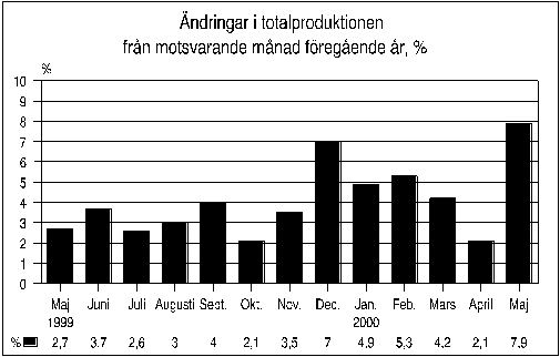 I maj 2000 var totalproduktionen 7,9 procent större än i maj 1999. I april ökade produktionen med 2,1 procent från föregående år. Enligt Statistikcentralens månadsgraf över totalproduktionen ökade produktionen inom alla huvudnäringsgrenar i samhällsekonomin.