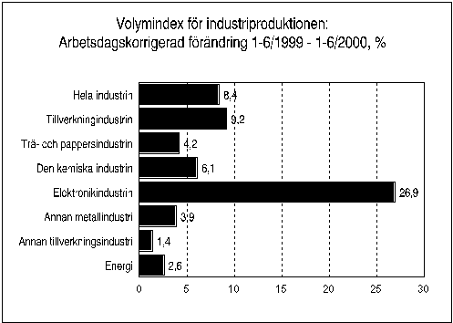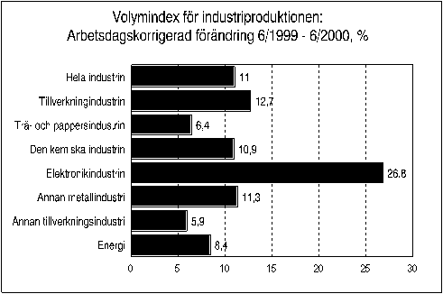 Enligt Statistikcentralen var den arbetsdagskorrigerade industriproduktionen i juni 11,0 procent större än i juni i fjol. Under perioden januari-juni ökade produktionen med 8,4 procent från motsvarande period år 1999.