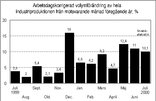 Industrins arbetsdagskorrigerade produktion var i juli enligt Statistikcentralen 10,1 procent större än i juli 1999. Under perioden januari-juli ökade industriproduktionen med 8,3 procent jämfört med motsvarande period i fjol. Dessa förhandsuppgifter grundar sig på de uppgifter Statistikcentralen hade tillgång till den 30 augusti.