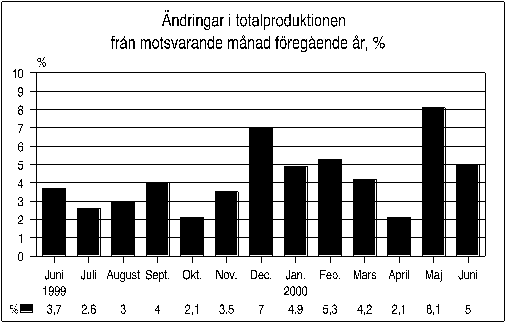 Totalproduktionens volym var i juni 2000 5,0 procent större än i juni 1999. I maj var produktionsökningen 8,1 procent jämfört med föregående år. Totalproduktionens volym var under första halvåret 4,9 procent större än under perioden januari-juni 1999. Enligt Statistikcentralens månadsgraf över totalproduktionen ökade produktionen i juni inom samtliga huvudnäringsgrenar av samhällsekonomin.