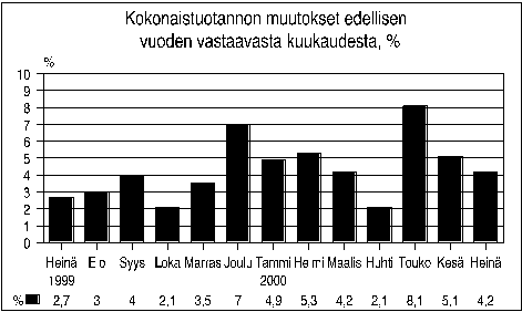 Kokonaistuotannon määrä oli heinäkuussa 4,2 prosenttia suurempi kuin vuoden 1999 heinäkuussa. Kesäkuussa tuotanto kasvoi 5,1 prosenttia edellisestä vuodesta. Tilastokeskuksen laskeman kokonaistuotannon kuukausikuvaajan mukaan tuotanto kasvoi heinäkuussa maa- ja metsätaloutta lukuun ottamatta kansantalouden kaikilla päätoimialoilla.