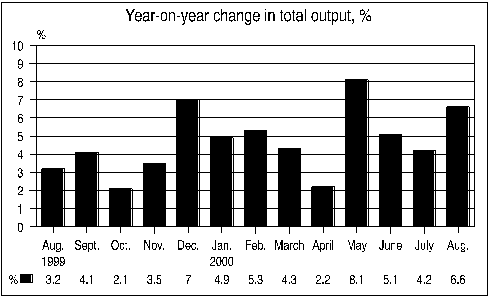 The volume of total output was 6.6 per cent greater in August 2000 than in August 1999. In July, output grew by 4.2 per cent from the previous year. The Monthly Indicator of Total Output of Statistics Finland indicates that output went up in all main industries of the national economy in August.