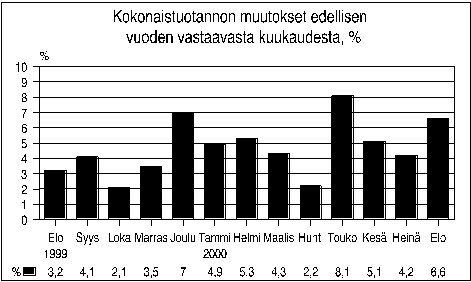 Kokonaistuotannon määrä oli elokuussa 6,6 prosenttia suurempi kuin vuoden 1999 elokuussa. Heinäkuussa tuotanto kasvoi 4,2 prosenttia edellisestä vuodesta. Tilastokeskuksen laskeman kokonaistuotannon kuukausikuvaajan mukaan tuotanto kasvoi elokuussa kansantalouden kaikilla päätoimialoilla.
