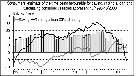 Thirty-eight per cent of consumers viewed the time favourable for raising a loan, while the figure in September was 44 per cent. One year ago three consumers out of four thought it worthwhile to take out a loan. Intentions to raise a loan also decreased slightly in October. Thirteen per cent of households intended to do so in the next 12 months. In October, 58 per cent of consumers considered it worthwhile to save money, and 69 per cent of households believed they would be able to lay aside some money in the next 12 months. The corresponding proportions were 55 and 66 per cent in September.