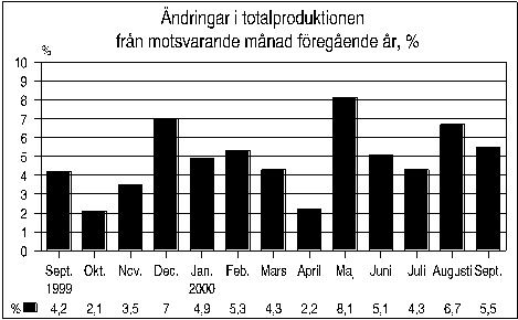 I september i år var totalproduktionen 5,5 procent större än i september 1999. I augusti ökade produktionen med 6,7 procent från föregående år. Enligt Statistikcentralens månadsgraf över totalproduktionen ökade produktionen i september inom alla huvudnäringsgrenar i samhällsekonomin med undantag av handeln.