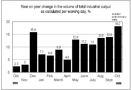 According to Statistics Finland, industrial output as calculated per working day was as much as 18.2 per cent higher in October 2000 than in October 1999. In Finland growth figures have last been higher than this over 20 years ago, in July 1980. These exceptionally high growth figures are partly explained by the slow growth of only good 2 per cent in the reference period, i.e. last year's October. In the January to October period, industrial output grew by 10.7 per cent compared to the same period last year. These instant preliminary data are based on information available to Statistics Finland on 29 November.