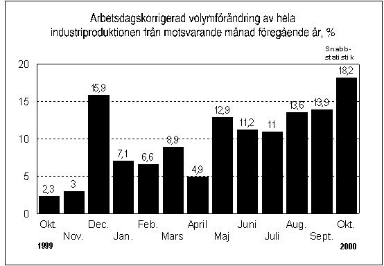 Enligt Statistikcentralen var den arbetsdagskorrigerade industriproduktionen i oktober rentav 18,2 procent större än i oktober 1999. Senast var tillväxtsiffrorna i Finland högre för mer än 20 år sedan, i juli 1980. De exceptionellt höga tillväxtsiffrorna kan delvis förklaras av att ökningen under jämförelseperioden, dvs. oktober i fjol, var långsam, bara drygt 2 procent. Under januari-oktober ökade industriproduktionen med 10,7 procent från motsvarande period i fjol. Denna förhandsstatistik bygger på de uppgifter som Statistikcentralen hade tillgång till före den 29 november.