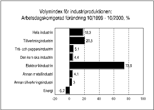 Enligt Statistikcentralen var den arbetsdagskorrigerade industriproduktionen i oktober rekordartat 18,3 procent större än året förut. Under januari-oktober ökade produktionen med 10,8 procent från i fjol. Föregående gång var tillväxten i Finland snabbare för drygt 20 år sedan. Största delen av ökningen beror på ökningen av tillverkningen av eltekniska produkter, som var rentav 74 procent. Ökningen av industriproduktionen utan eltekniska produkter var bara 3,2 procent. Den kraftiga ökningen, även internationellt sett, beror delvis på att ökningen under jämförelseperioden, dvs. oktober i fjol, var rätt obetydlig.