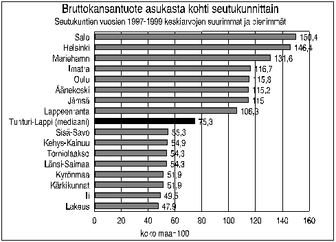 Seutukuntien kärkeen bruttokansantuotteella asukasta kohti mitattuna on noussut Salo menestyvän informaatio- ja tietoliikenneklusterinsa vauhdittamana. Toisena on Helsingin seutukunta palvelualojen kasvun johdosta ja kolmantena Maarianhaminan seutukunta meriliikenteen ansiosta. Neljäntenä on perinteisestä teollisuudesta tuotannon arvonsa saava Imatran seutukunta. Viidentenä on Oulu, pääosin informaatio- ja tietoliikenneklusterin ripeän kehityksen ansiosta. Seuraavina olevat seutukunnat ovat pääosin perinteisiä teollisuusseutuja.