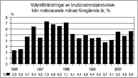 Under juli-september ökade bruttonationalprodukten med 5,6 procent jämfört med juli-september i fjol. Metallindustrin stod för 3,1 procentenheter av tillväxten. Under januari-september ökade bruttonationalprodukten med 5,3 procent. Ekonomin har nu kontinuerligt ökat ända sedan slutet av år 1993. Uppgifterna framgår av Statistikcentralens förhandsuppgifter om nationalräkenskaperna.