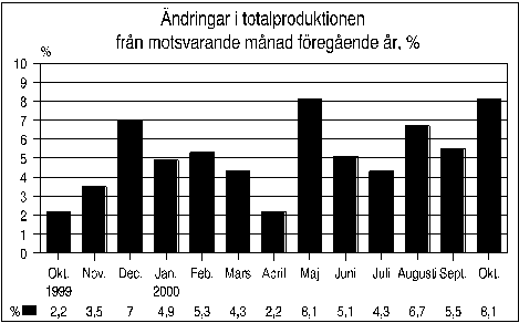I oktober i år var totalproduktionen 8,1 procent större än i oktober 1999. I september ökade produktionen med 5,5 procent från föregående år. Enligt Statistikcentralens månadsgraf över totalproduktionen ökade produktionen i oktober inom alla huvudnäringsgrenar i samhällsekonomin.