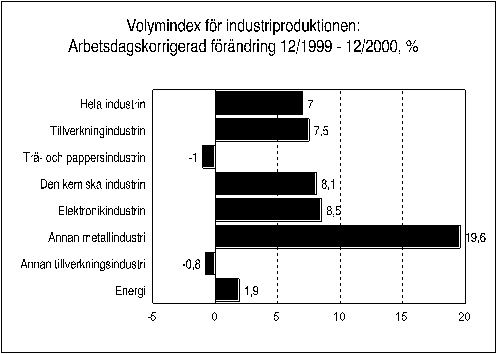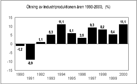 Enligt Statistikcentralen ökade industriproduktionen år 2000 rentav med 11,1 procent. Föregående gång ökade industriproduktionen lika kraftigt år 1994, som visserligen föregicks av depressionen i början av 1990-talet.