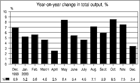 Output in trade grew by 1.5 per cent and in construction by less than one per cent from the previous year. In agriculture and forestry output contracted by 10 per cent as a result of the decrease in fellings and meat production. Output in transport also went down by 2 per cent. Output in other services and government services increased by nearly 3 per cent from December 1999.