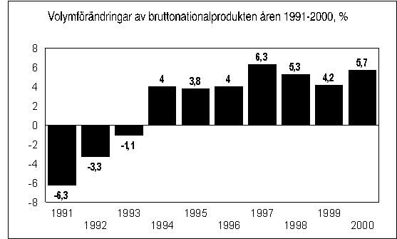 Bruttonationalproduktens volym ökade med 5,7 procent år 2000 enligt Statistikcentralens preliminära uppgifter. Förra året var det sjunde tillväxtåret i följd. Under årets sista kvartal ökade bruttonationalprodukten med 5,5 procent jämfört med motsvarande period året förut.