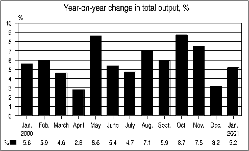 The volume of total output was 5.2 per cent greater in January 2001 than in January 2000. In December 2000, output grew by 3.2 per cent from the previous year. The Monthly Indicator of Total Output of Statistics Finland indicates that output went up in all main industries of the national economy in January.