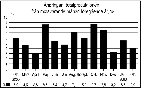 I februari 2001 var totalproduktionen 3,9 procent större än i februari 2000. I januari ökade produktionen med 5,5 procent från föregående år. Enligt Statistikcentralens månadsgraf över totalproduktionen höll industrin av huvudnäringsgrenarna uppe ekonomins snabba tillväxt i februari.