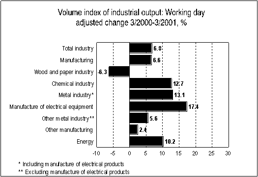 According to Statistics Finland, Finnish industrial output as calculated per working day went up by 6.8 per cent in the year to March.