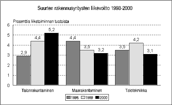 Suurille talonrakennusyrityksille kertyi viime vuonna 21 miljardin markan tuotoista liikevoittoa 5,2 prosenttia ja nettotulosta 3,5 prosenttia. Edellisvuoden vastaavat tulosprosentit olivat 4,4 ja 3,4. Talotekniikan ja erikoisrakentamisen aloilla kannattavuuskehitys heikkeni. Liikevoittoa syntyi 6 miljardin tuotoista 3,1 prosenttia ja nettotulosta 3,3 prosenttia. Myös maa- ja vesirakennusalan kannattavuus laski hieman. 7,8 miljardin tuotoista alan liikevoitto oli 3,2 ja nettotulos 1,6 prosenttia. Tiedot käyvät ilmi Tilastokeskuksen laatimasta suurten rakennusyritysten tilinpäätöstilastosta.